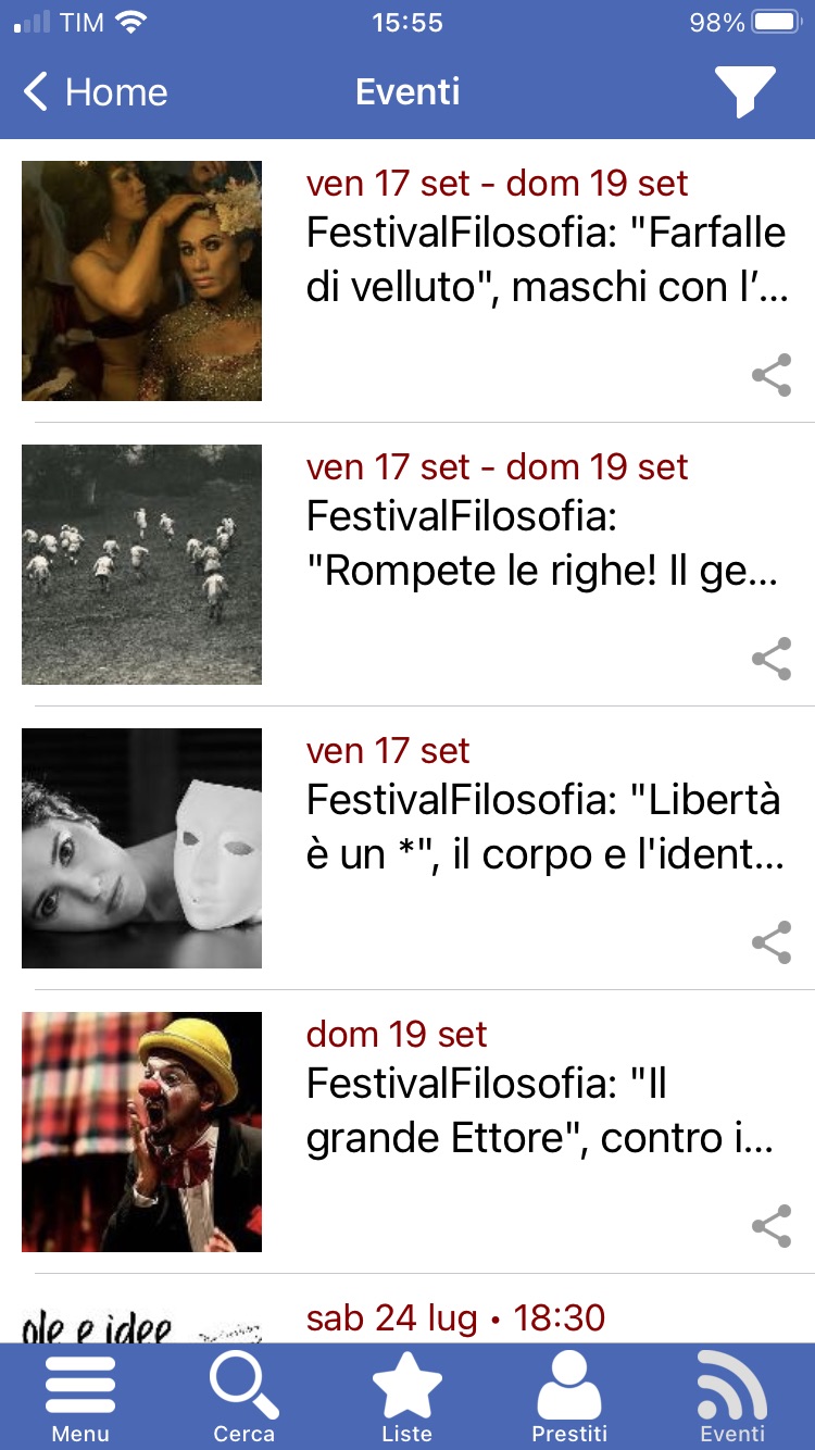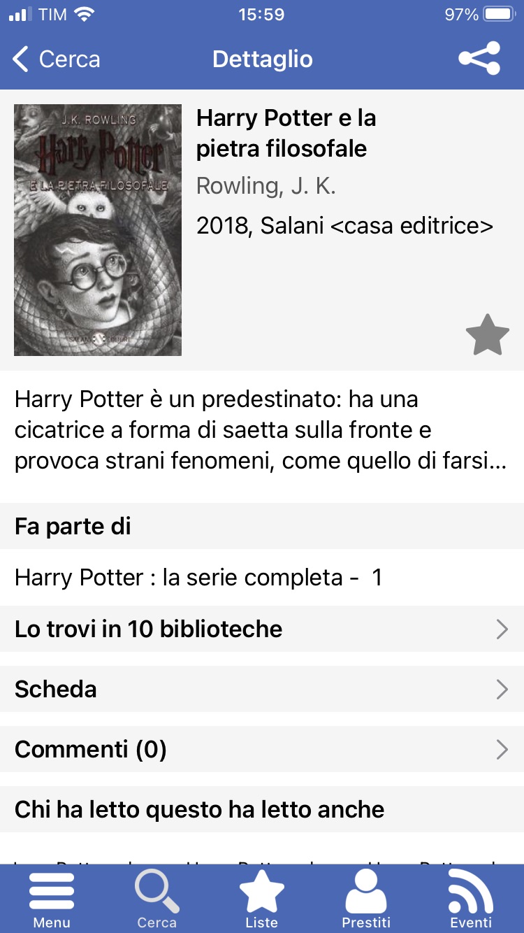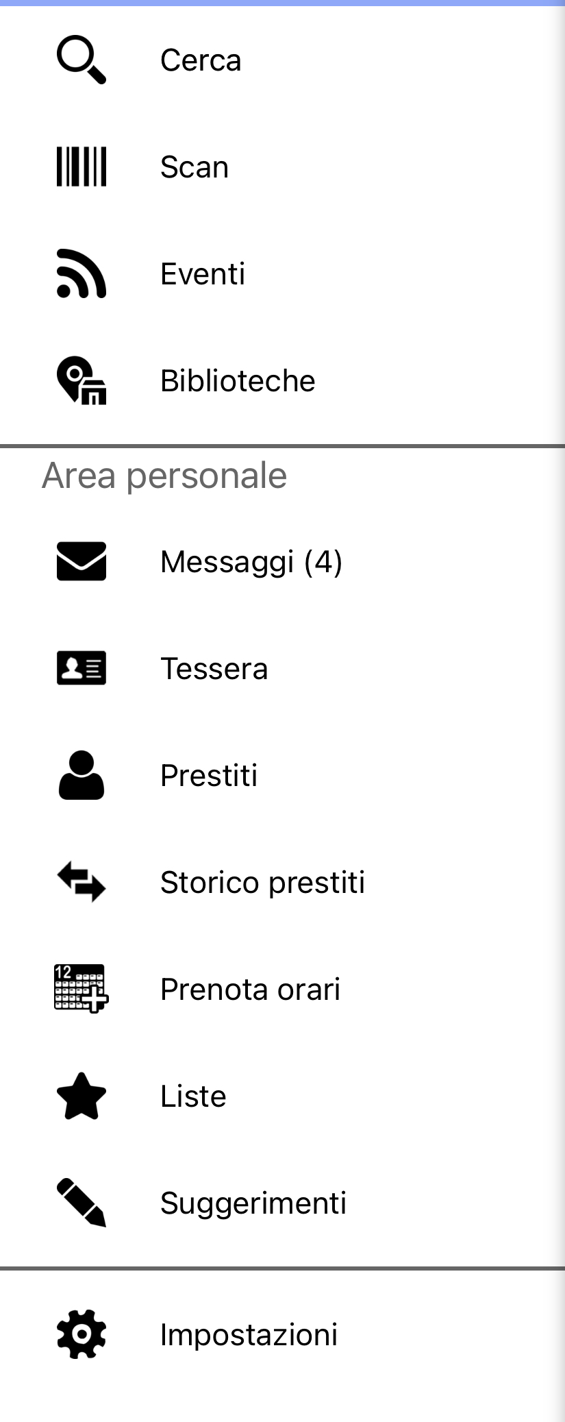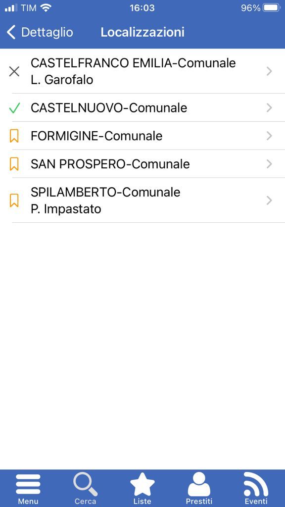 Le icone più piccole in basso (visibili solo nell'ambiente iOS) permettono di raggiungere: il Menù completo, la Ricerca titoli, le Liste, i Prestiti in corso e gli Eventi.