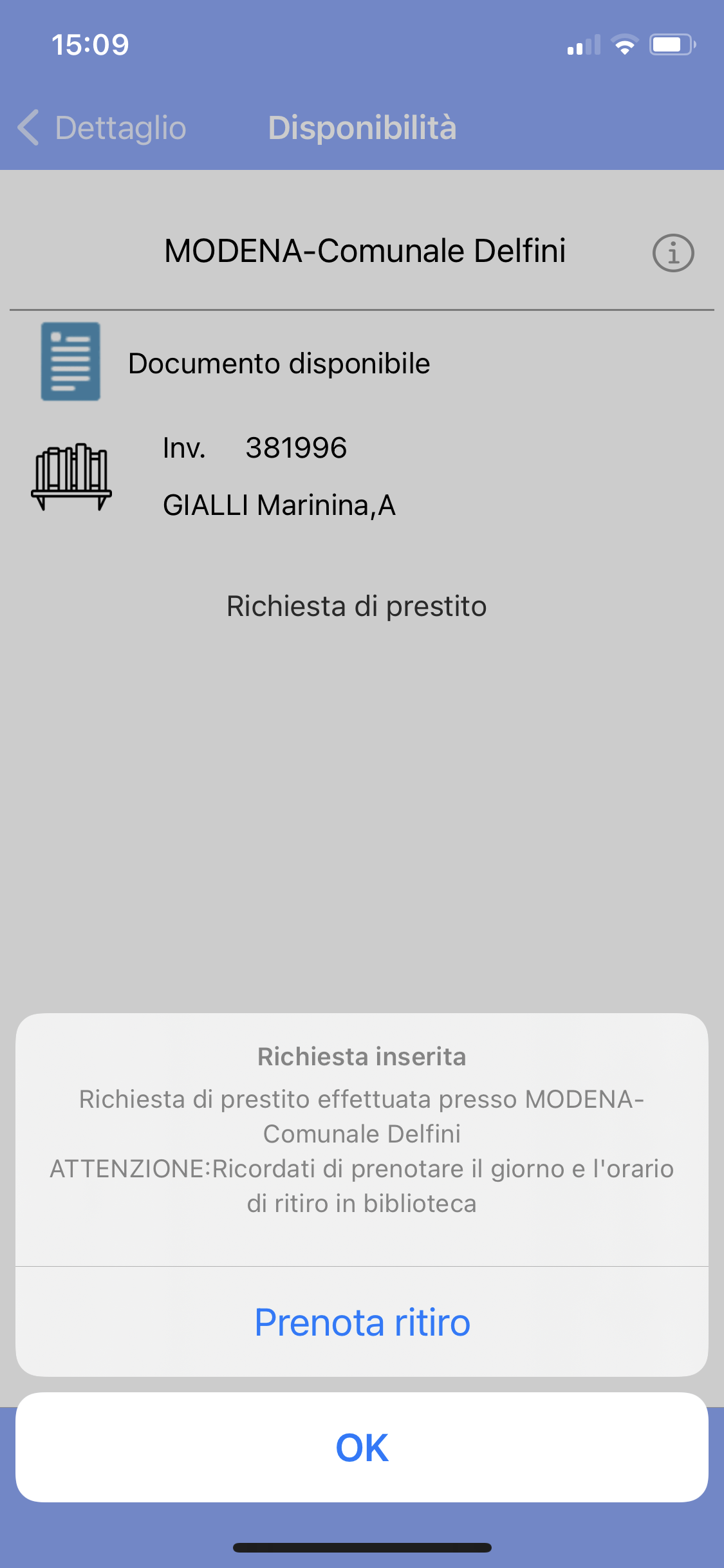 - se c'è già una richiesta di prestito in corso, verrà visualizzata; altrimenti un pop-up avvisa che non ci sono prenotazioni in atto;