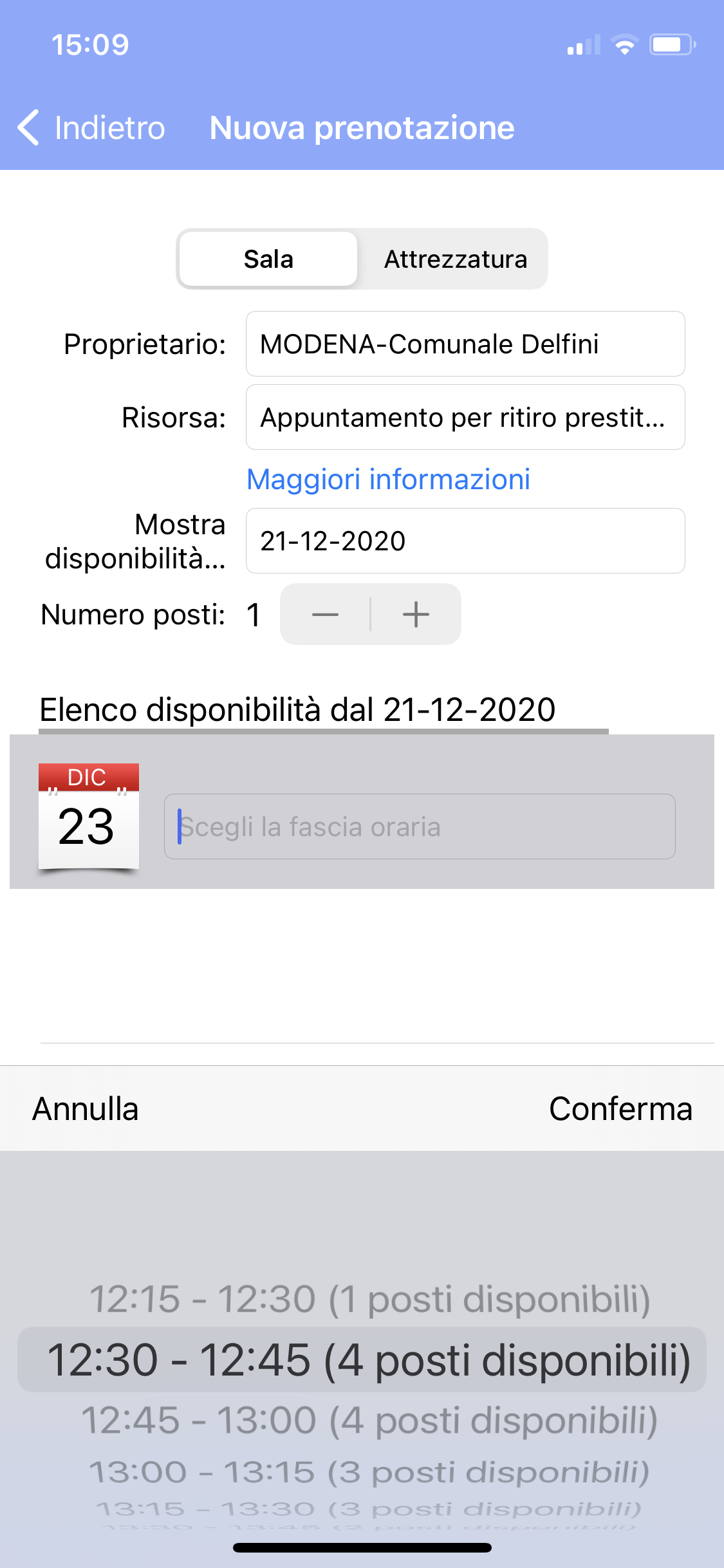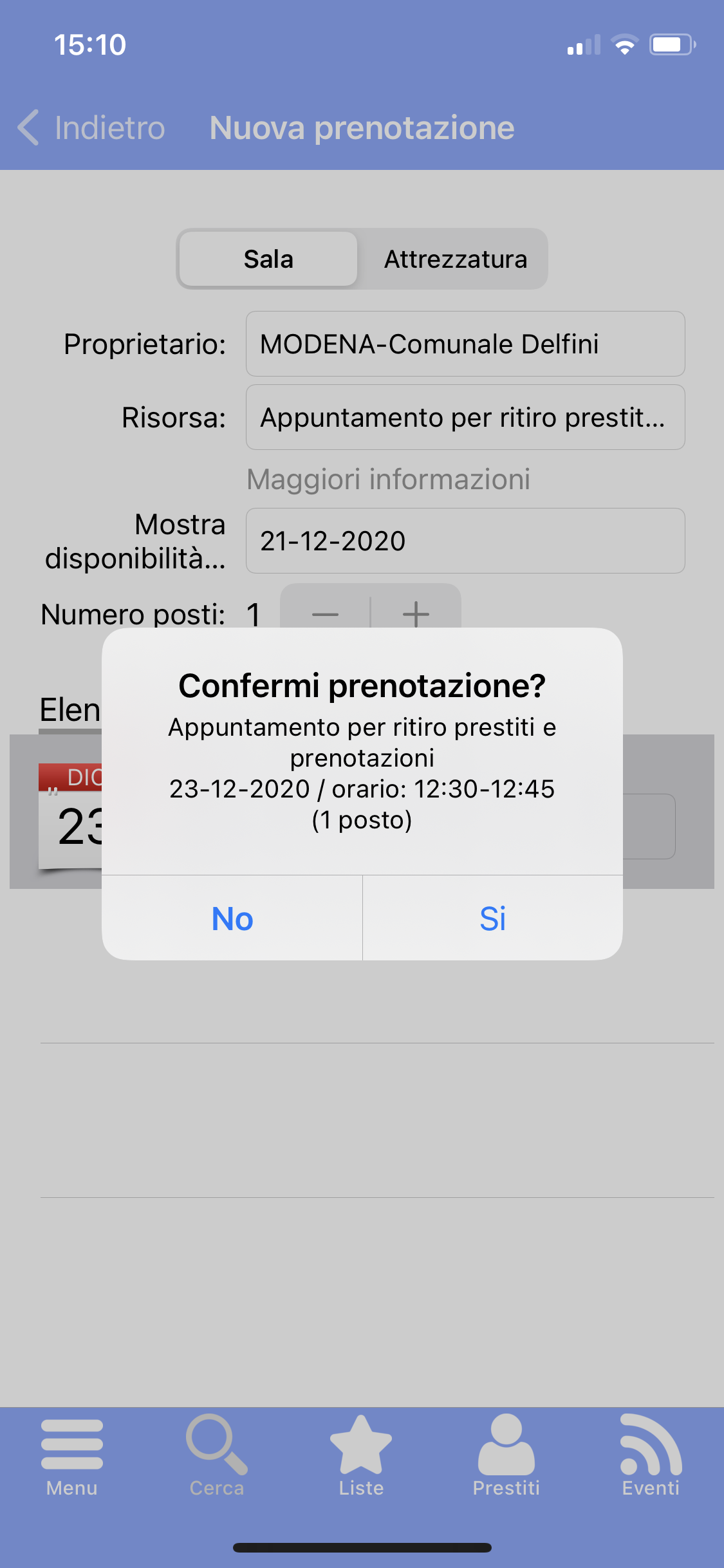 - un pop-up chiede di confermare la prenotazione, indicando giorno e orario richiesti. Premendo Sì si conferma la prenotazione.