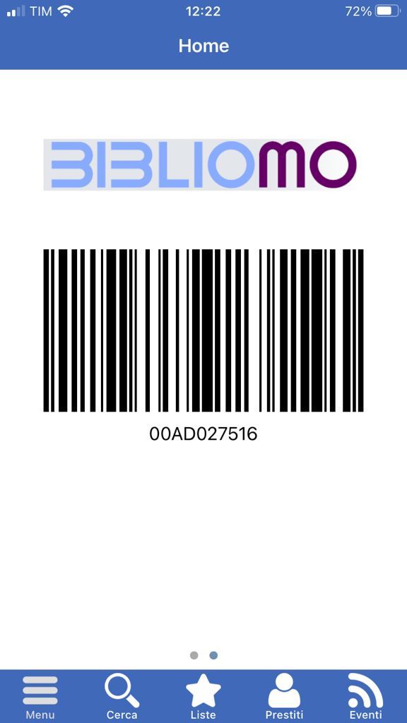- Tessera: viene visualizzata la tessera utente, utilizzabile per le operazioni di prestito e autoprestito (funzione raggiungibile anche scorrendo la homepage verso sinistra);