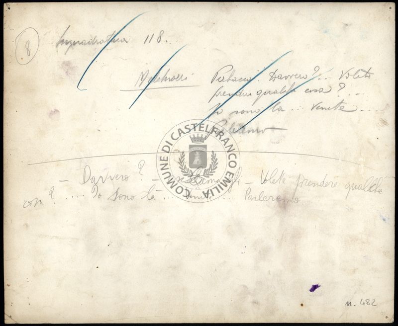 Sul recto indicazione stampata riporta: Grandi film Storici S.A.I. - L'amante segreta - Regia di C. Gallone, Foto Pesce, Esclusività I.C.I. Sul verso note manoscritte riportano il numero dell'inquadratura e le battute.