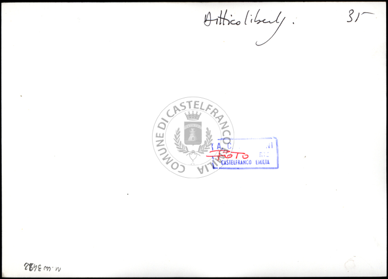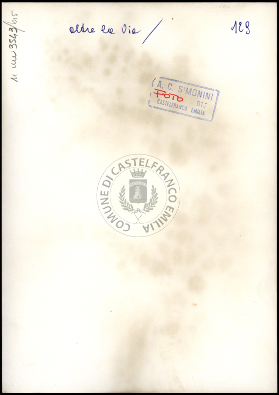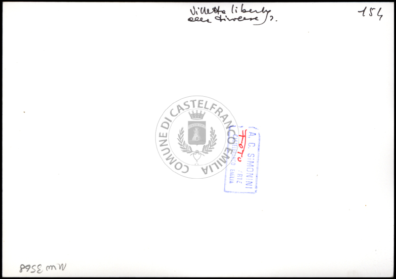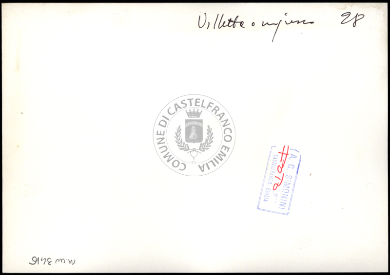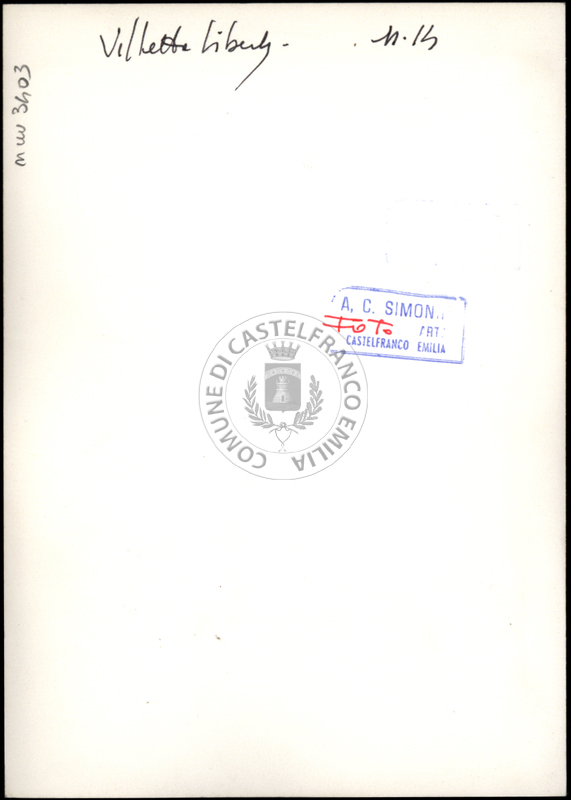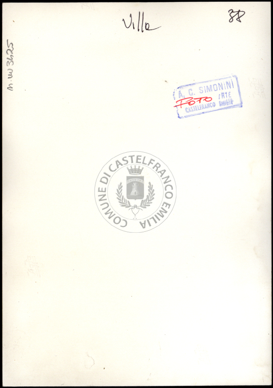 Note e decorazioniSul verso nota manoscritta riporta: n. 38 Villa. Sul verso timbro ad inchiostro riporta: A.C. Simonini Arte Castelfranco Emilia. Nota manoscritta dall’Autore della raccolta, all’interno del timbro, riporta: Foto.