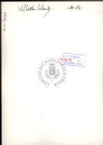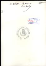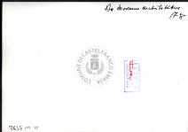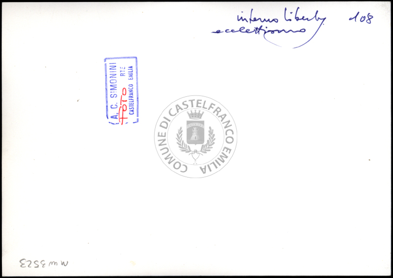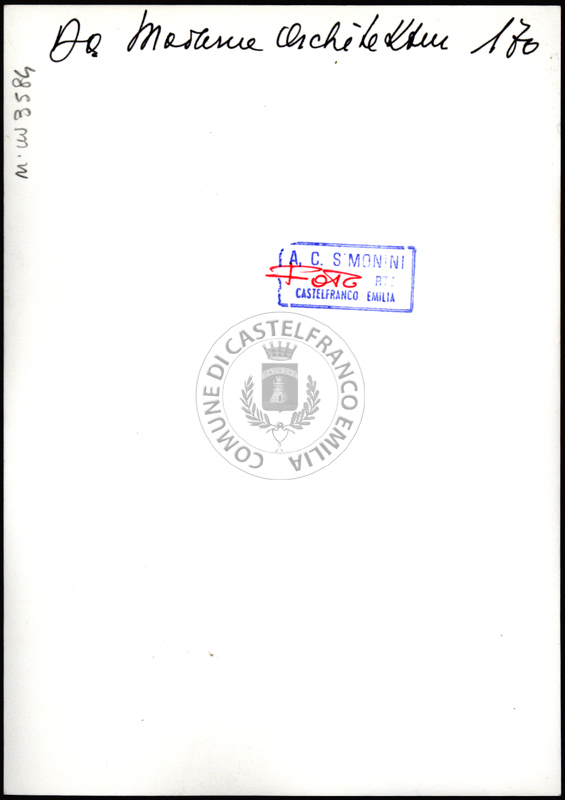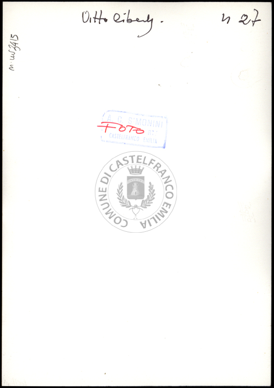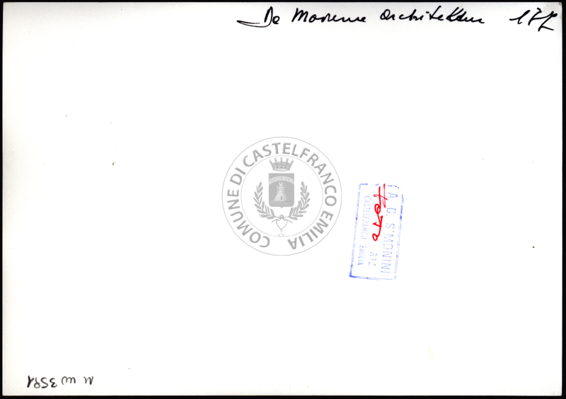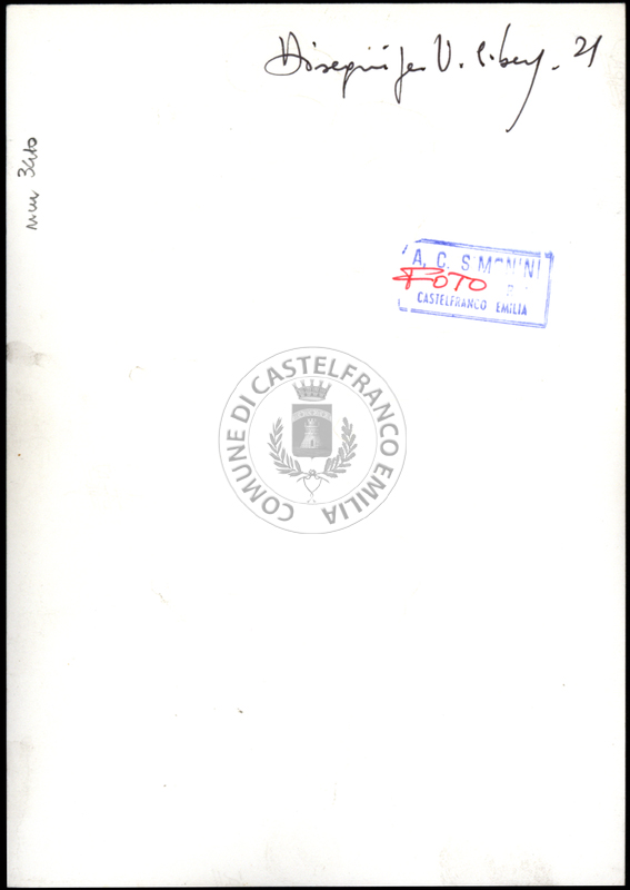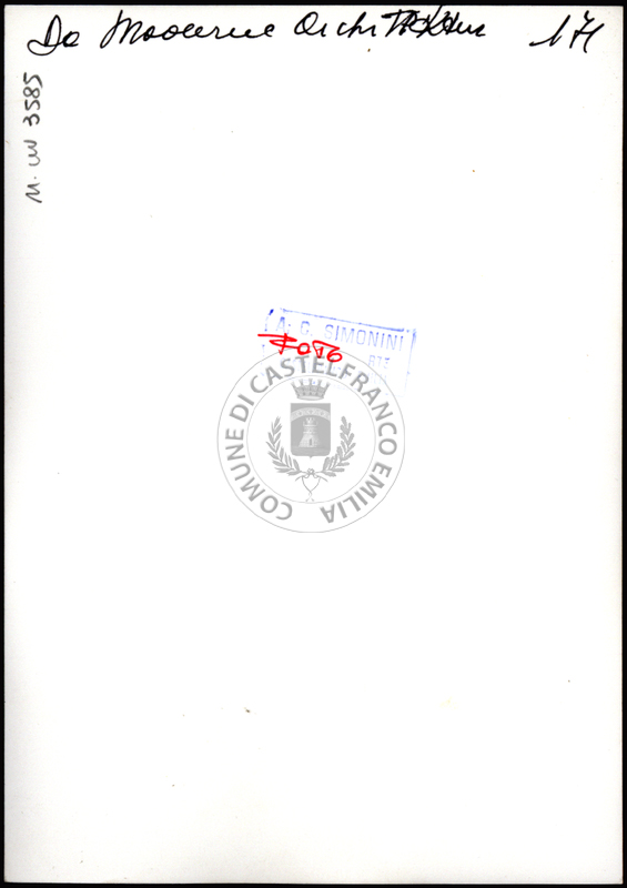 Note e decorazioniSul verso nota manoscritta riporta: n. 44 Progetto. Sul verso timbro ad inchiostro riporta: A.C. Simonini Arte Castelfranco Emilia. Nota manoscritta dall’Autore della raccolta, all’interno del timbro, riporta: Foto.