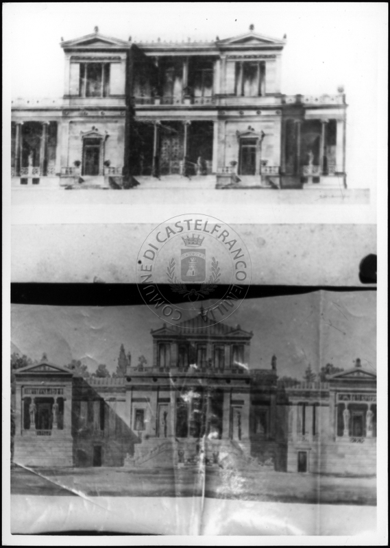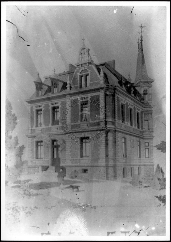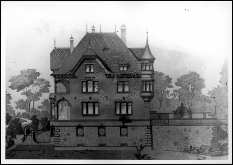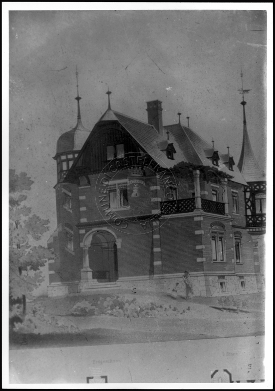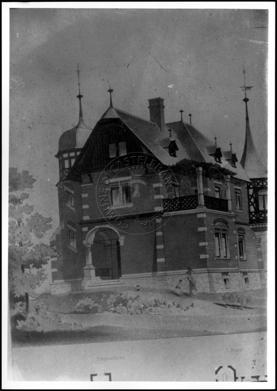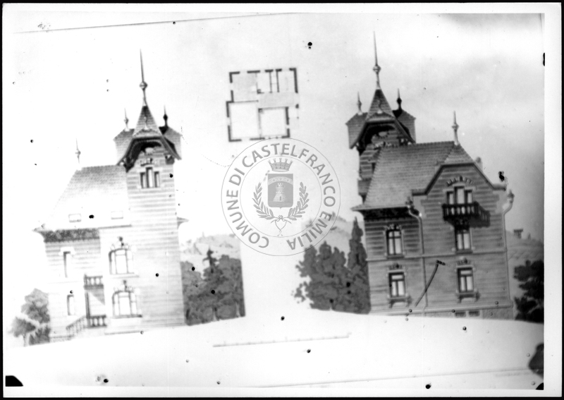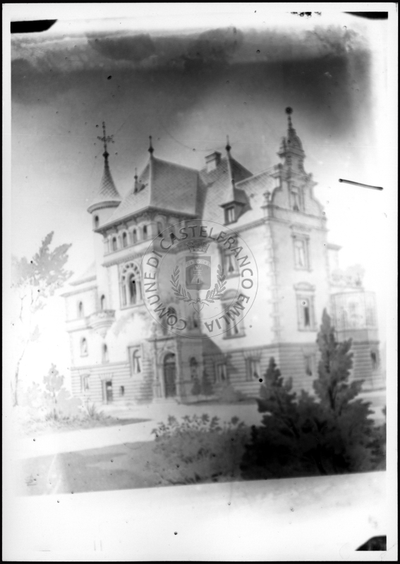 Note e decorazioniSul verso nota manoscritta riporta: 151 Progetto di villa con torre. Sul verso timbro ad inchiostro riporta: A.C. Simonini Arte Castelfranco Emilia. Nota manoscritta dall’Autore della raccolta, all’interno del timbro, riporta: Foto