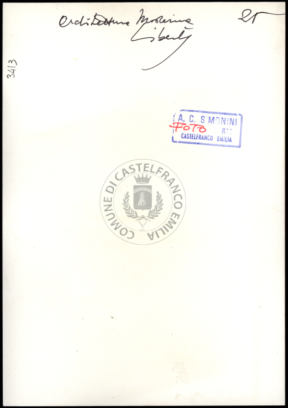 Note e decorazioniSul verso nota manoscritta riporta: n.25 Archittetura Moderna Liberty. Sul verso timbro ad inchiostro riporta: A.C. Simonini Arte Castelfranco Emilia. Nota manoscritta dall’Autore della raccolta, all’interno del timbro, riporta: Foto.