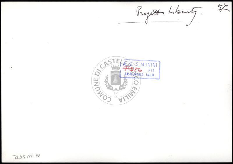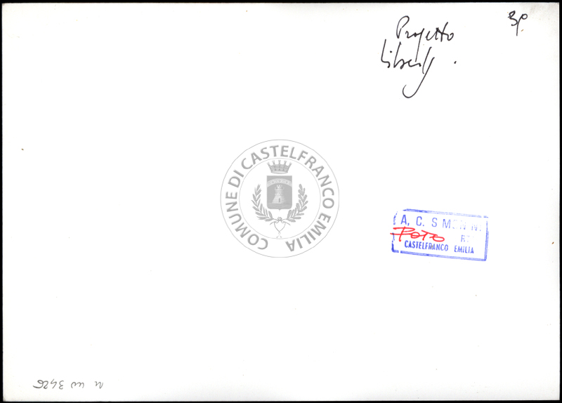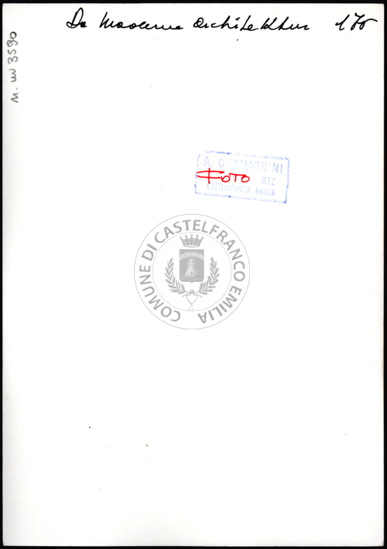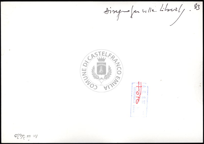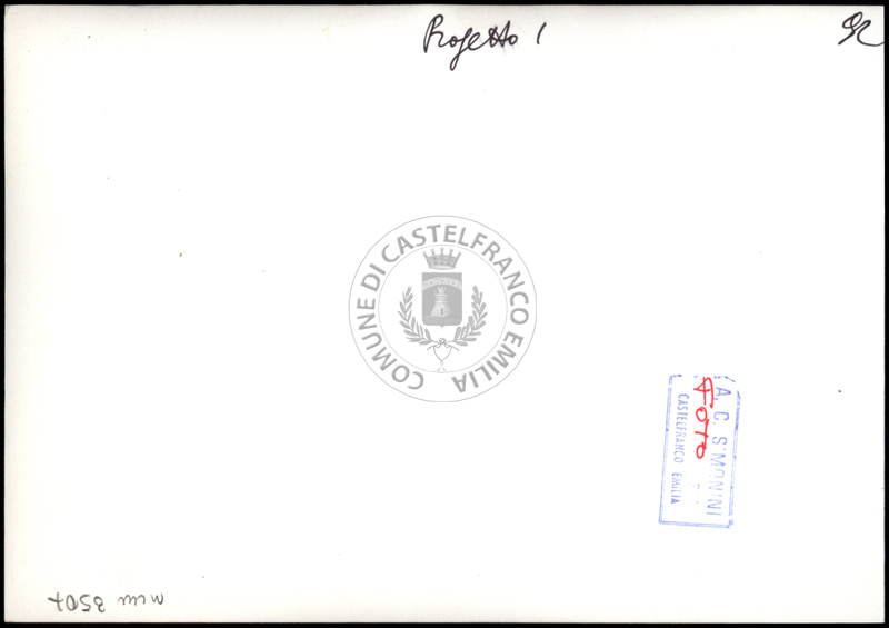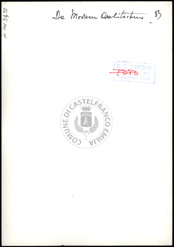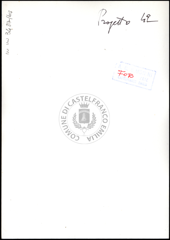 Note e decorazioniSul verso nota manoscritta riporta: 92 Progetto 1. Sul verso timbro ad inchiostro riporta: A.C. Simonini Arte Castelfranco Emilia. Nota manoscritta dall’Autore della raccolta, all’interno del timbro, riporta: Foto.