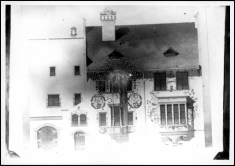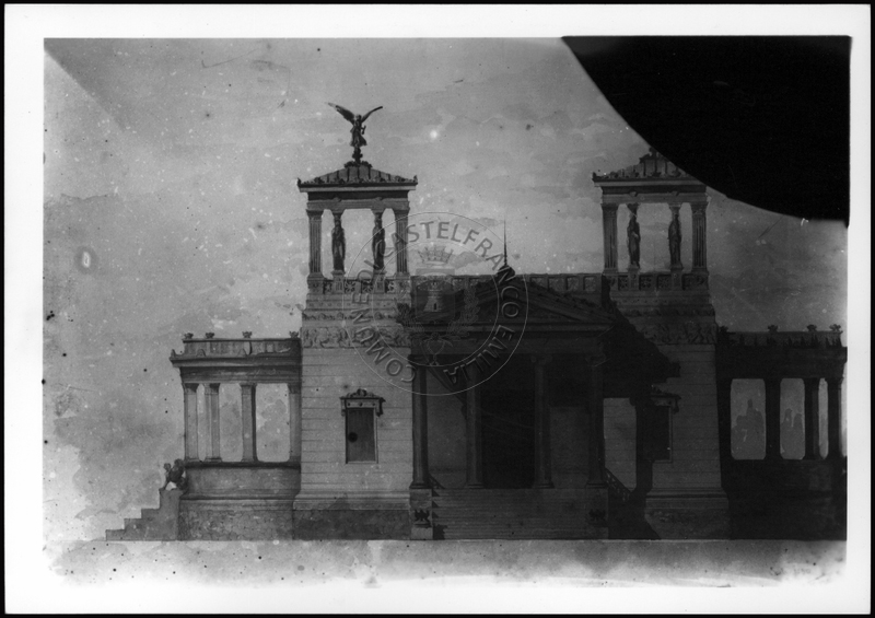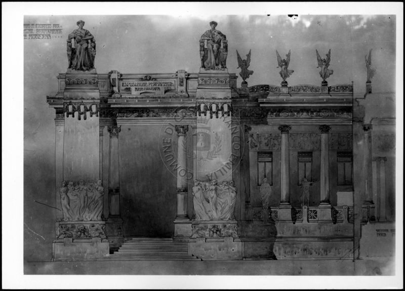 Note e decorazioniSul verso nota manoscritta riporta: 128 Progetto facciata liberty ecclettismo o neoromanticismo. Sul verso timbro ad inchiostro riporta: A.C. Simonini Arte Castelfranco Emilia. Nota manoscritta dall’Autore della raccolta, all’interno del timbro, riporta: Foto