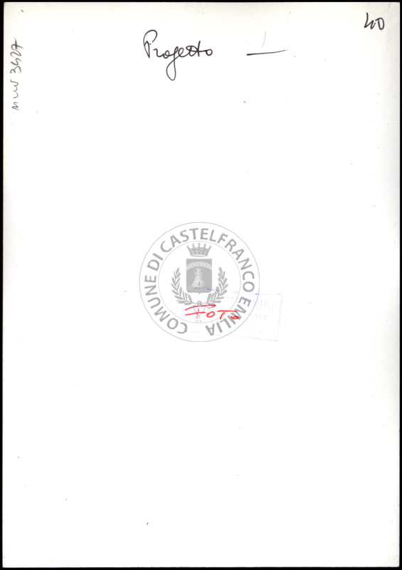 Note e decorazioniSul verso nota manoscritta riporta: n. 40 Progetto. Sul verso timbro ad inchiostro riporta: A.C. Simonini Arte Castelfranco Emilia. Nota manoscritta dall’Autore della raccolta, all’interno del timbro, riporta: Foto.