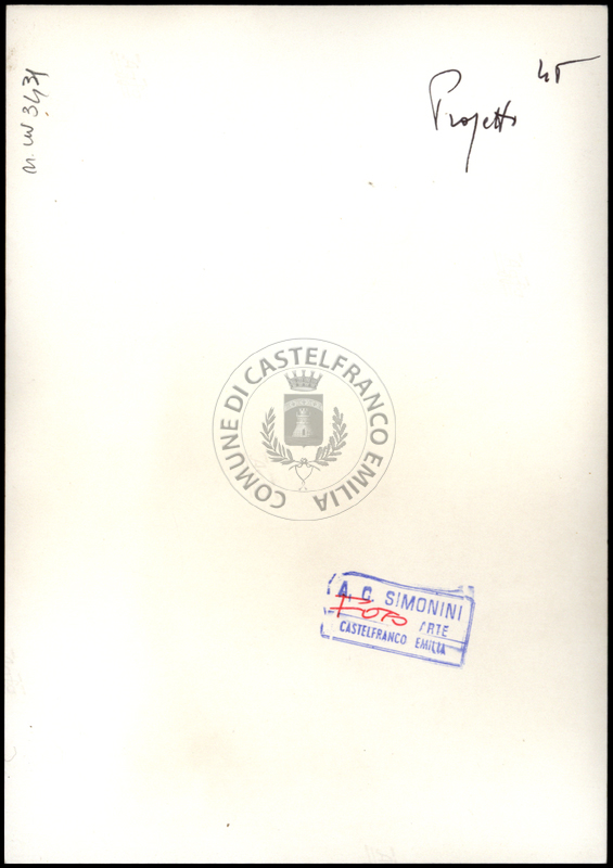 Note e decorazioniSul verso nota manoscritta riporta: n. 45 Progetto. Sul verso timbro ad inchiostro riporta: A.C. Simonini Arte Castelfranco Emilia. Nota manoscritta dall’Autore della raccolta, all’interno del timbro, riporta: Foto.