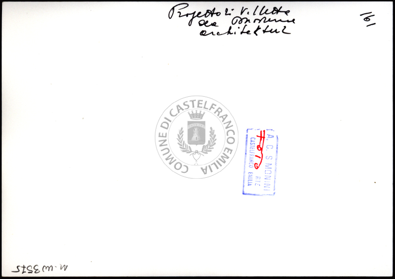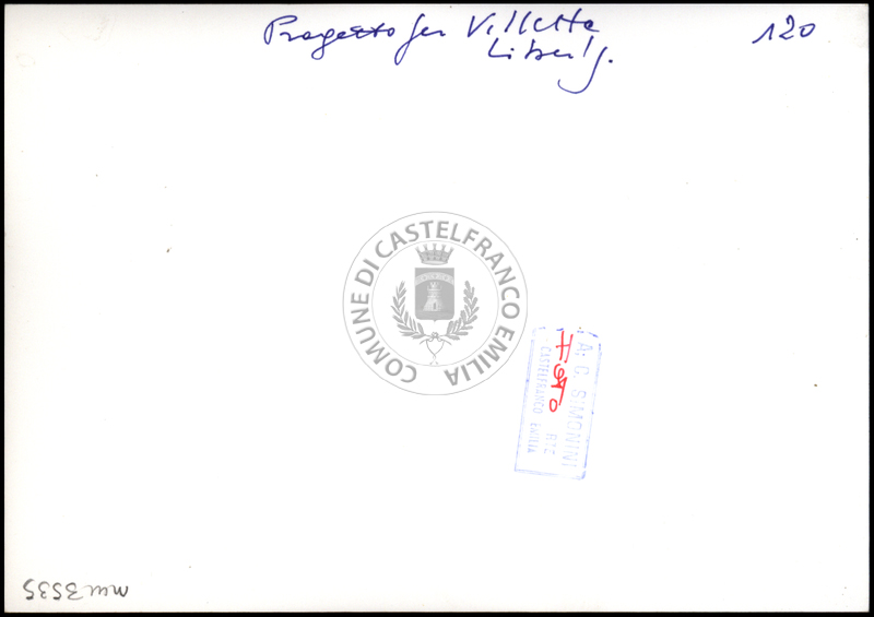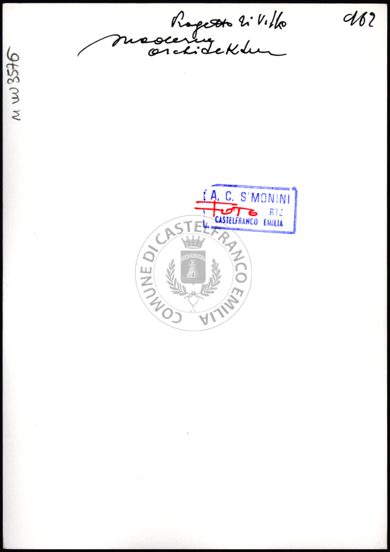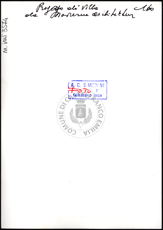 Note e decorazioniSul verso nota manoscritta riporta:122 Progetto di Villetta. Sul verso timbro ad inchiostro riporta: A.C. Simonini Arte Castelfranco Emilia. Nota manoscritta dall’Autore della raccolta, all’interno del timbro, riporta: Foto