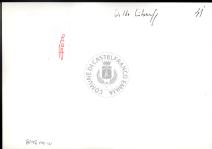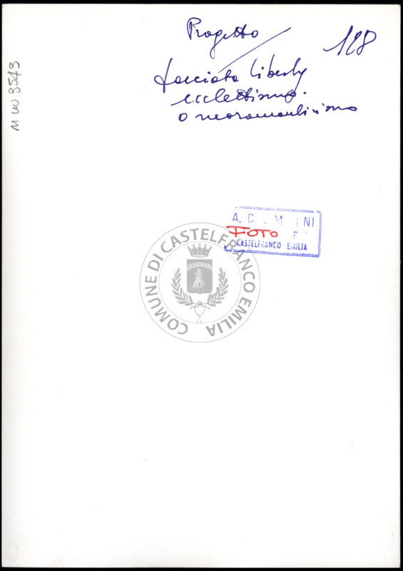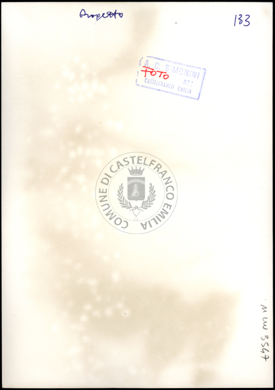 Note e decorazioniSul verso nota manoscritta riporta: 133 Progetto. Sul verso timbro ad inchiostro riporta: A.C. Simonini Arte Castelfranco Emilia. Nota manoscritta dall’Autore della raccolta, all’interno del timbro, riporta: Foto