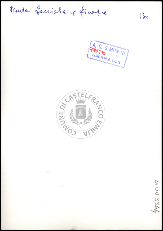Note e decorazioniSul verso nota manoscritta riporta: 130 Pianta facciata e finestra. Sul verso timbro ad inchiostro riporta: A.C. Simonini Arte Castelfranco Emilia. Nota manoscritta dall’Autore della raccolta, all’interno del timbro, riporta: Foto