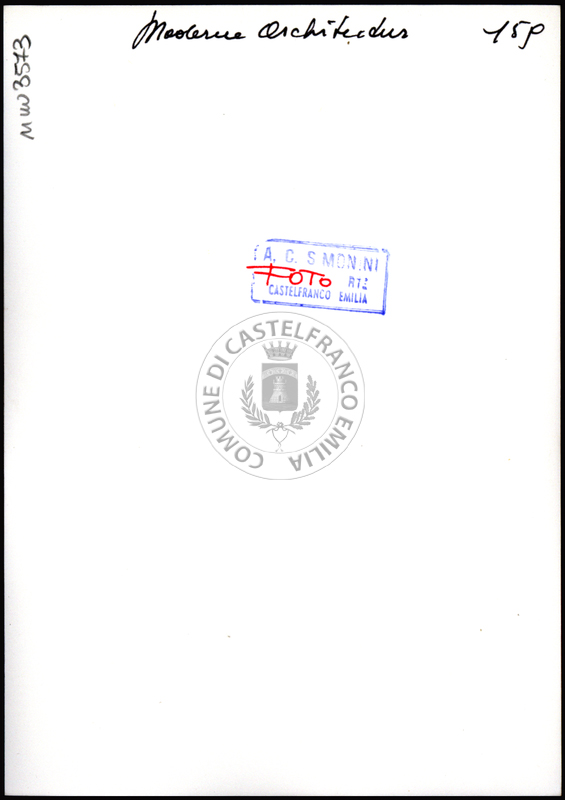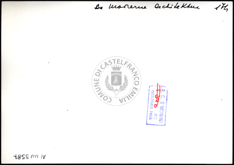Note e decorazioniSul verso nota manoscritta riporta: 176 Da Moderne Architektur. Sul verso timbro ad inchiostro riporta: A.C. Simonini Arte Castelfranco Emilia. Nota manoscritta dall’Autore della raccolta, all’interno del timbro, riporta: Foto