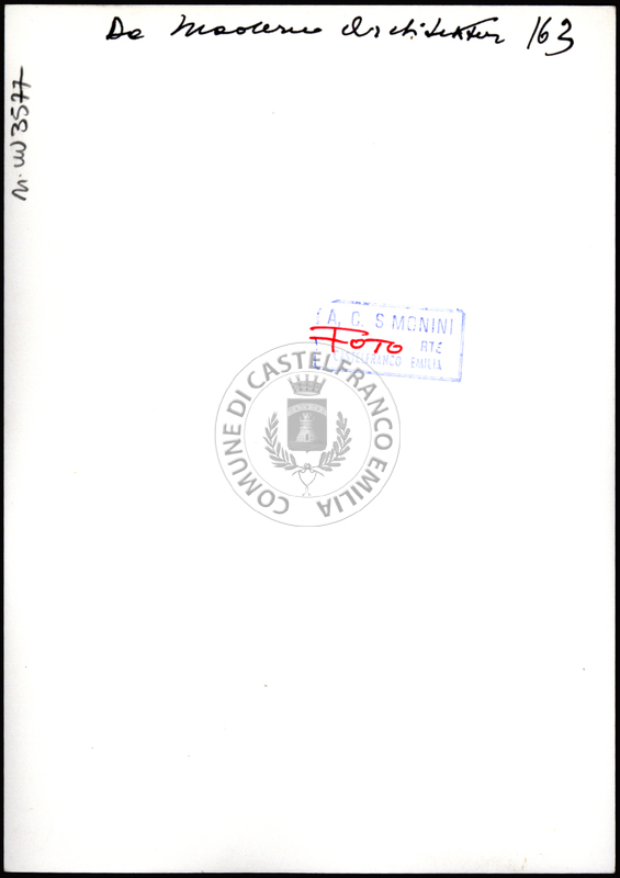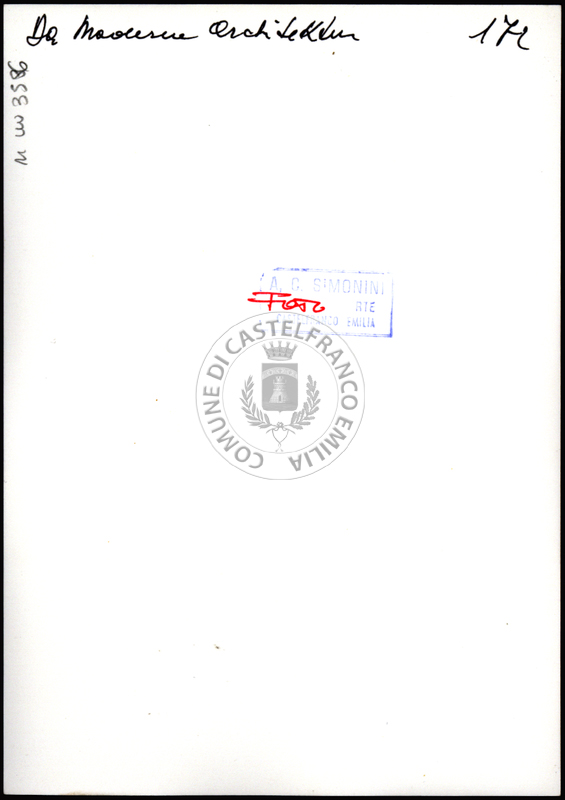 Note e decorazioniSul verso nota manoscritta riporta: 177 Da Moderne Architektur. Sul verso timbro ad inchiostro riporta: A.C. Simonini Arte Castelfranco Emilia. Nota manoscritta dall’Autore della raccolta, all’interno del timbro, riporta: Foto