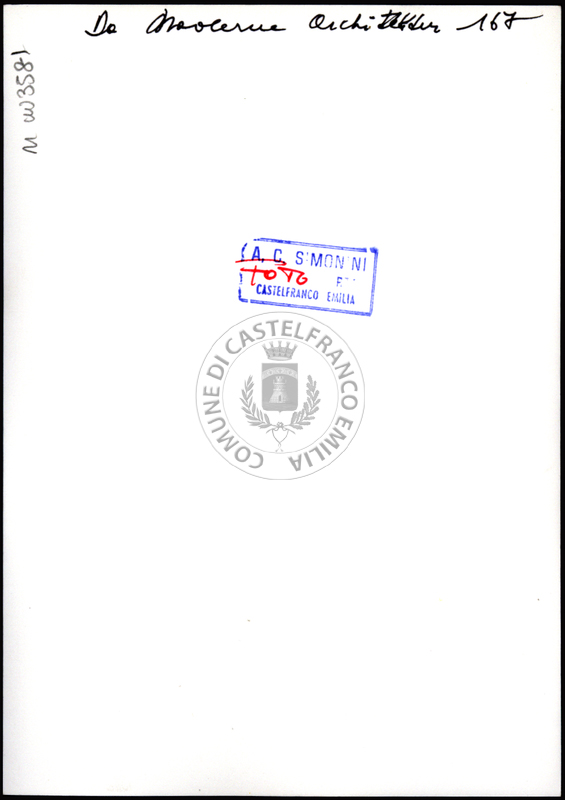Note e decorazioniSul verso nota manoscritta riporta: 167 Da Moderne Architektur. Sul verso timbro ad inchiostro riporta: A.C. Simonini Arte Castelfranco Emilia. Nota manoscritta dall’Autore della raccolta, all’interno del timbro, riporta: Foto