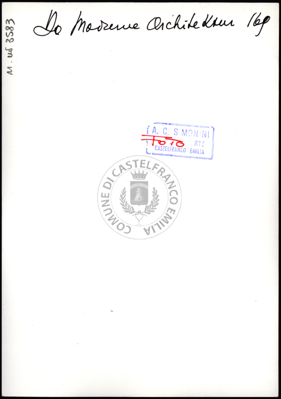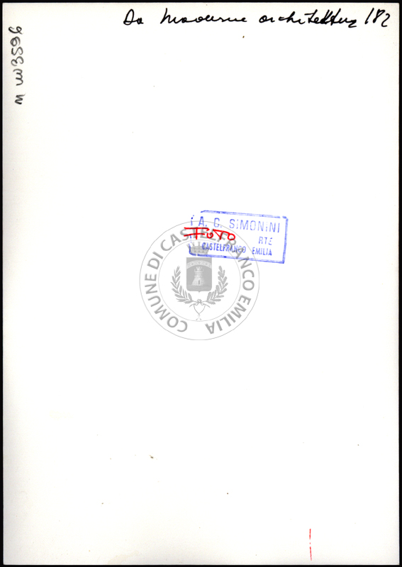 Note e decorazioniSul verso nota manoscritta riporta: 182 Da Moderne Architektur. Sul verso timbro ad inchiostro riporta: A.C. Simonini Arte Castelfranco Emilia. Nota manoscritta dall’Autore della raccolta, all’interno del timbro, riporta: Foto