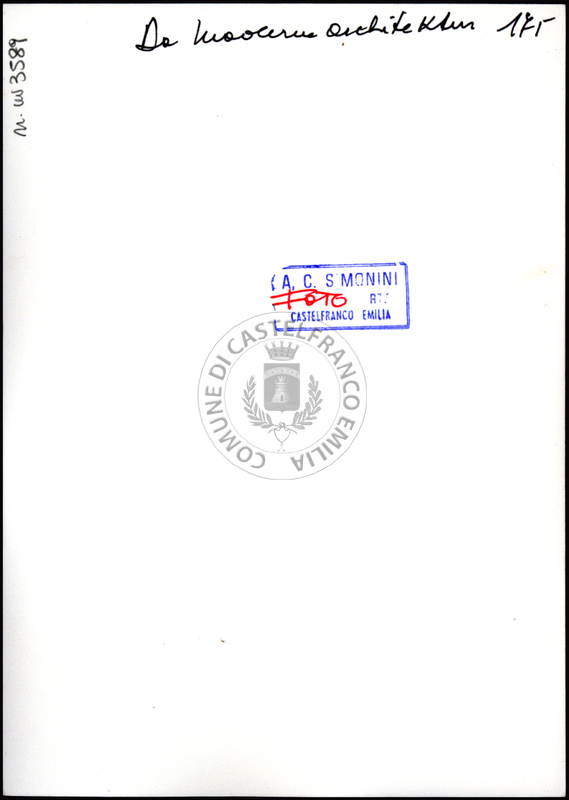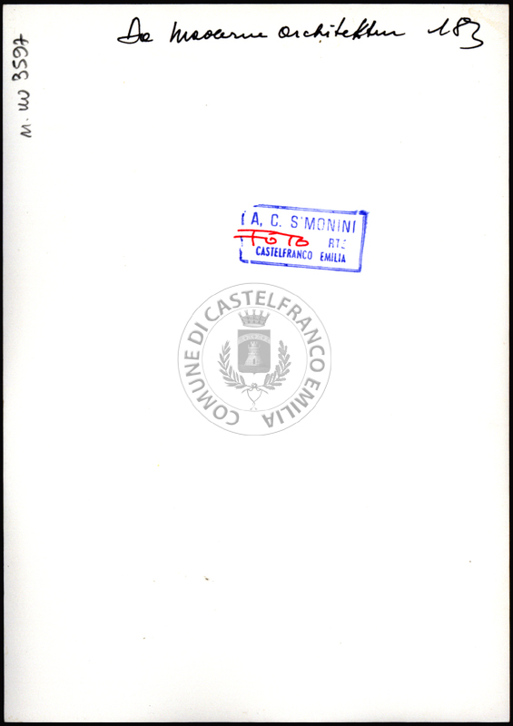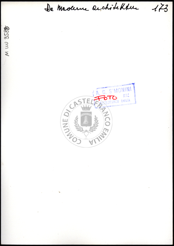 Note e decorazioniSul verso nota manoscritta riporta: 174 Da Moderne Architektur. Sul verso timbro ad inchiostro riporta: A.C. Simonini Arte Castelfranco Emilia. Nota manoscritta dall’Autore della raccolta, all’interno del timbro, riporta: Foto