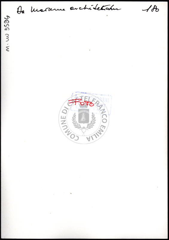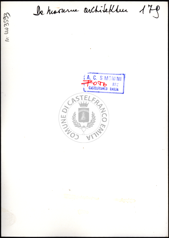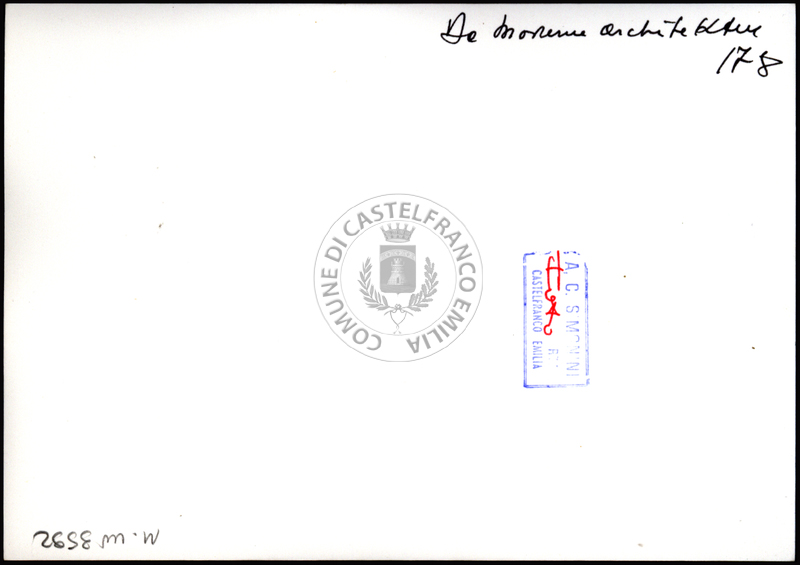 Note e decorazioniSul verso nota manoscritta riporta: 178 Da Moderne Architektur. Sul verso timbro ad inchiostro riporta: A.C. Simonini Arte Castelfranco Emilia. Nota manoscritta dall’Autore della raccolta, all’interno del timbro, riporta: Foto