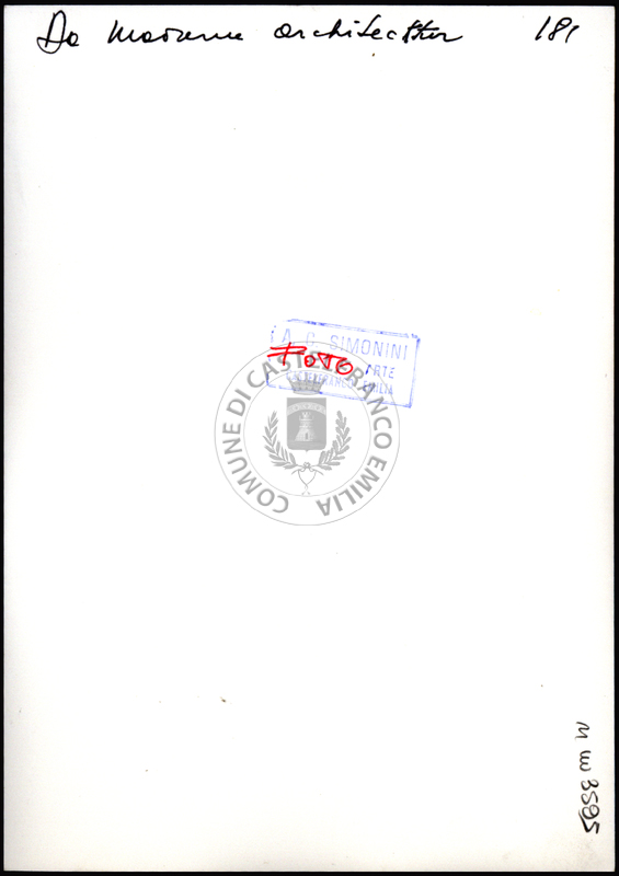 Note e decorazioniSul verso nota manoscritta riporta: 181 Da Moderne Architektur. Sul verso timbro ad inchiostro riporta: A.C. Simonini Arte Castelfranco Emilia. Nota manoscritta dall’Autore della raccolta, all’interno del timbro, riporta: Foto
