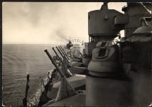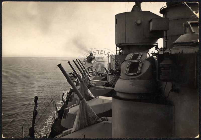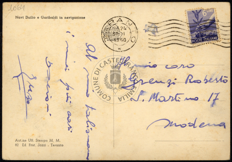 Cartolina viaggiata, timbro: Taranto 24 301 1950. Sul verso titolo riporta: Navi Duillio e Garibaldi in navgazione.