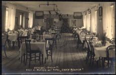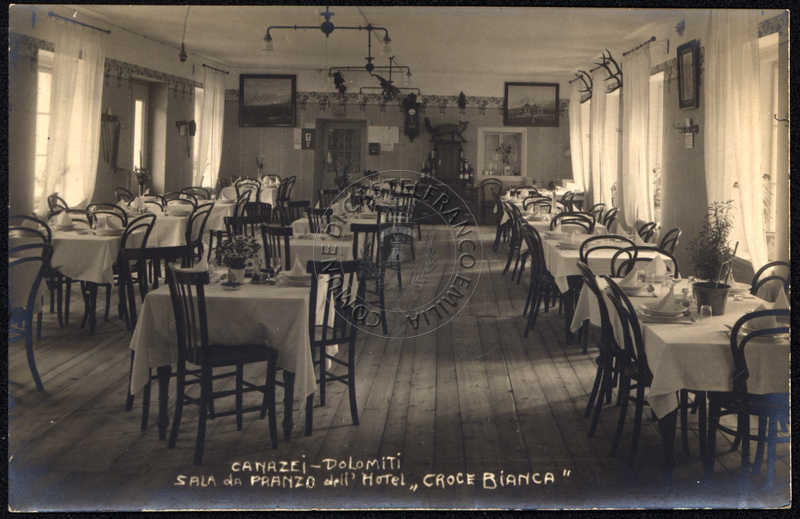 Sul recto titolo fotgrafico riporta: Canazei Dolomiti Salal da Pranzo dell'Hotel "Croce Bianca".