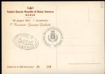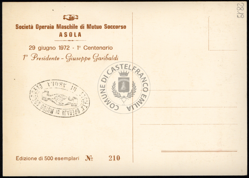 Sul verso timbro ad inchiostro riporta: Società Operaia di Muto Soccorso Asola. Esemplare numerato: n. 210.