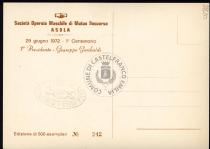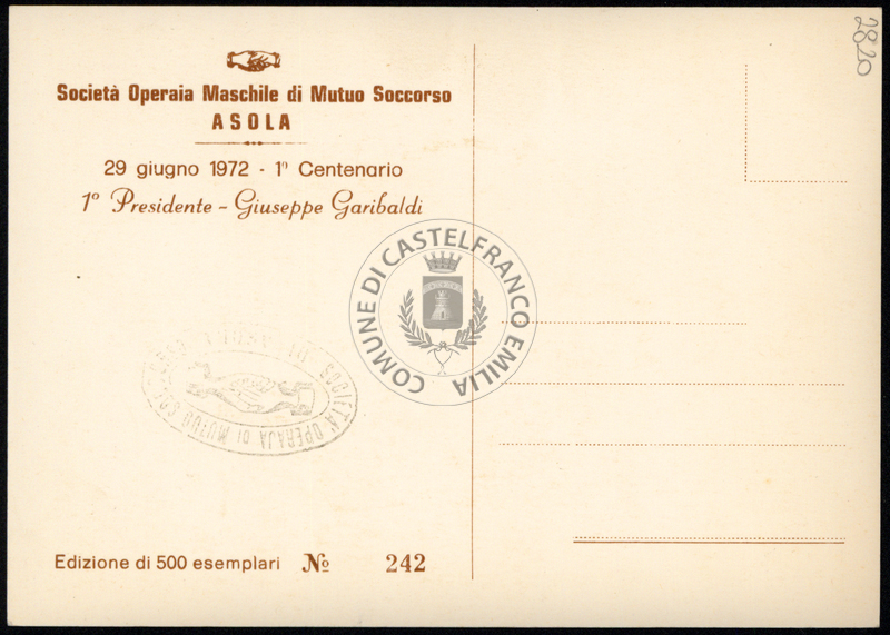 Sul verso timbro ad inchiostro riporta: Società Operaia di Muto Soccorso Asola. Esemplare numerato: n. 242.