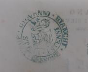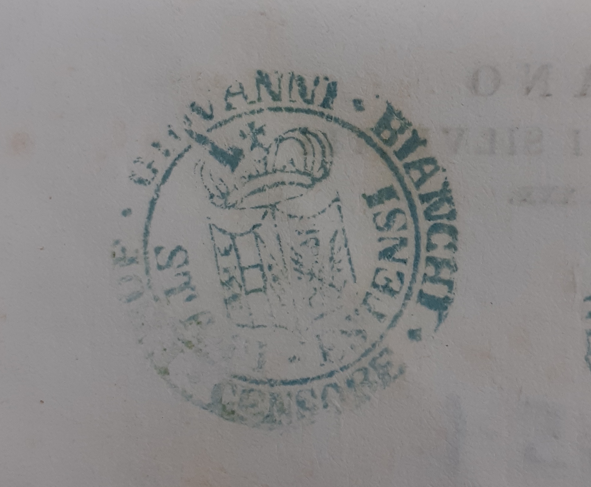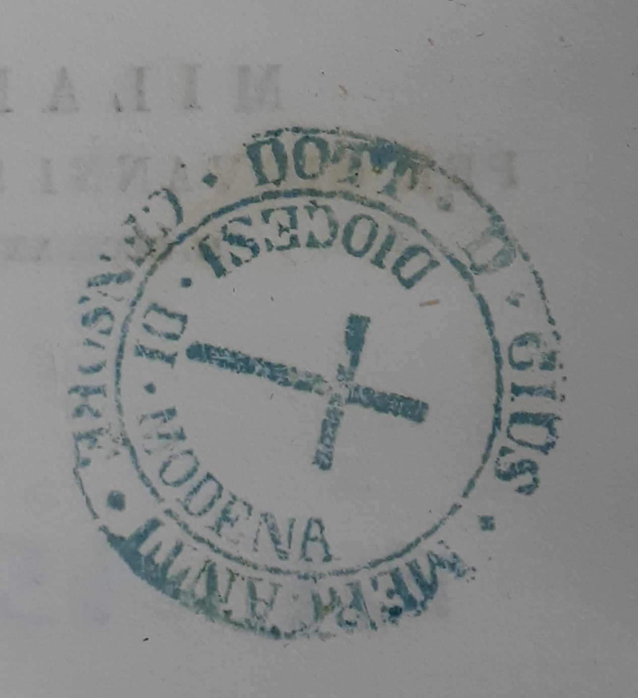 Timbri ad inchiostro: Biblioteca comunale di Finale. - Sul dorso e sulla controguardia anteriore etichetta a stampa: Biblioteca comunale Finale Emilia. - Sull'occhietto e sul verso dell’ultima carta timbri dei censori Giuseppe Mercanti: “Dott. D. Gius. Mercanti Censore Diocesi di Modena” e Giovanni Bianchi: “Prof. Giovanni Bianchi Censore Stati Estensi”.