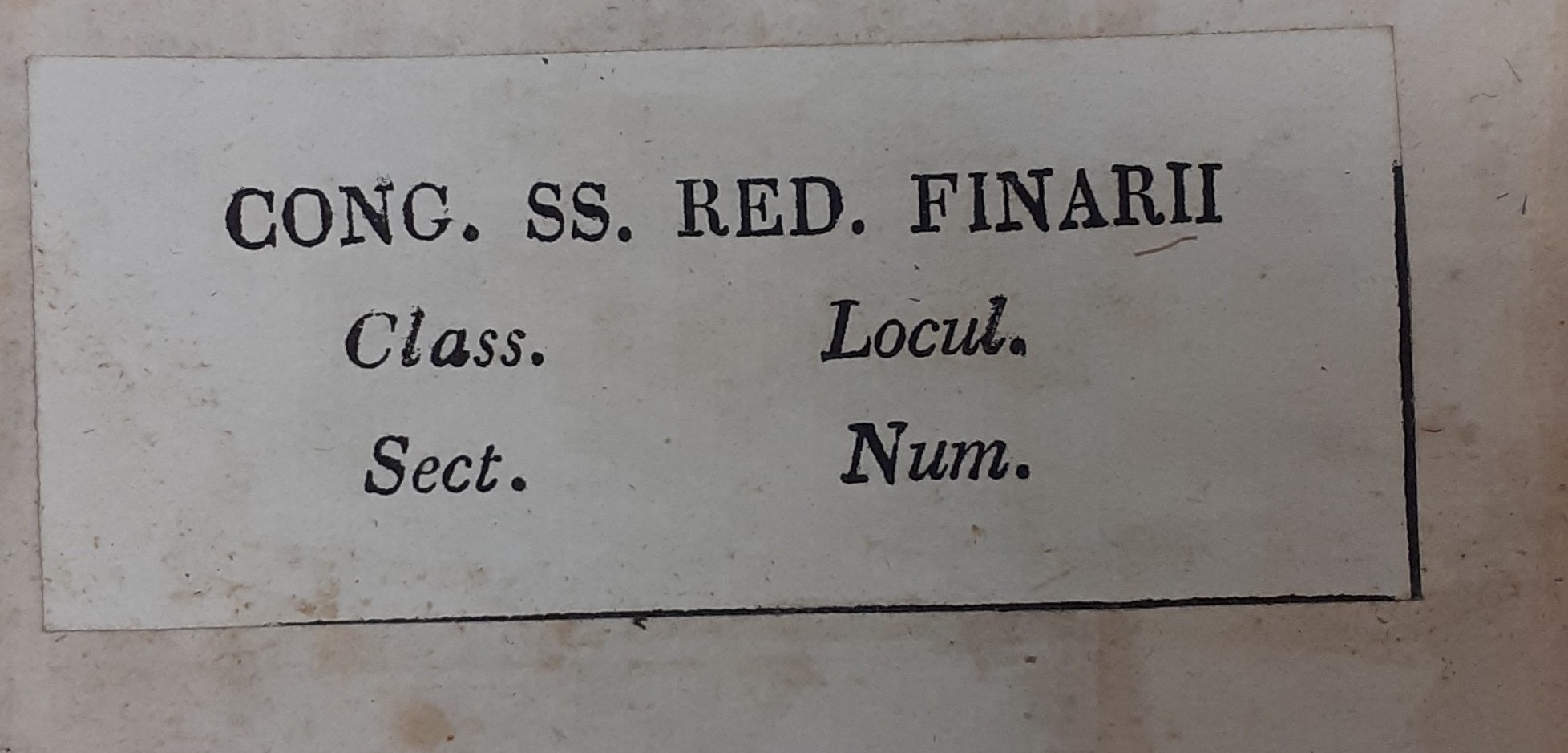 Timbri ad inchiostro: Biblioteca comunale Finale Emilia. - Sul dorso e sulla controguardia anteriore etichetta a stampa: Biblioteca comunale Finale Emilia. - Sul frontespizio timbro "R. Scuola tecnica Finale Emilia" e timbro "Censore Dott. G. Batt. Borsari. Stati Estensi" e vecchia segnatura. - Sul verso della copertina etichetta con dicitura: "Cong. SS. Red. Finarii".